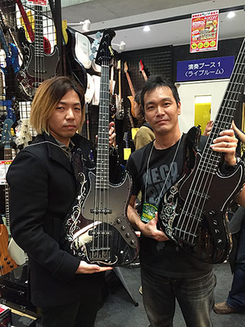 最後は奇跡的に今回の楽器フェアに間に合った「イケベ40周年記念 Sadowsky TYO 限定モデル」。イケベ楽器グランディベースの立崎さんと一緒にパチリ。私はインレイの部分だけ仕上げたので完成品を見たのはこの日が初めて。う〜む、美しいじゃありませんか。