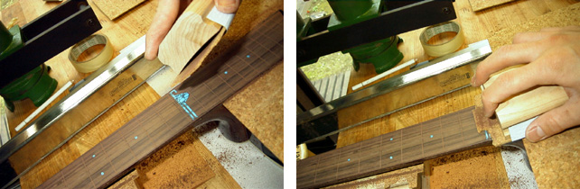 まずは白いエンピツで隙間がないところを指板の幅数カ所にわたり記していきます。次にその部分をスクレイパーなどで削っていきます。エンピツの線がなくなったらまた線を書き、また削りの繰り返しです。