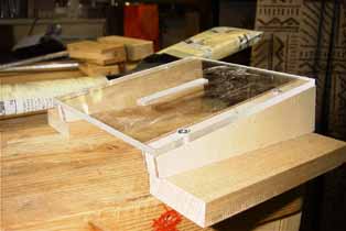 私はトリマーを使います。使用する刃(穴の幅)は6ミリか8ミリです。トリマーには「ガイド」という物があるのですが、アクリル板上の穴はその「ガイド」にピッタリ(まったく横振れしないよう) と合うように空けてあります。あとは掘りたい長さのところでストッパーなどを両面 テープでアクリル板に固定すれば正確な「長さ・幅」の穴が掘れる次第です。