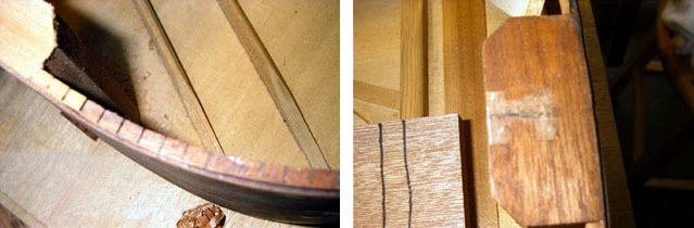 クランプを使い徐々に固定していきます。作業を行っている写 真は撮ってません(撮れません)。ハタガネを使いセンターの腰を始めに固定して、上半分を固定します。次に下半分を固定します。サウンドホールから手を入れて側板を押してやったりしながら可能なかぎりズレをなくして元どおりに接着します。