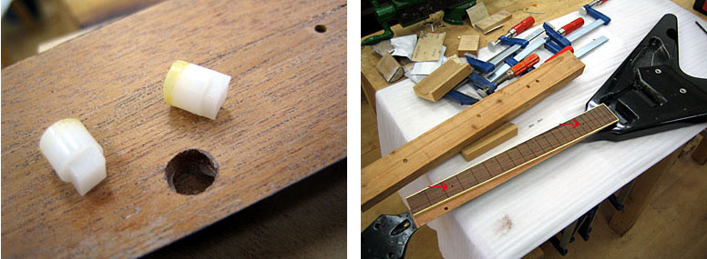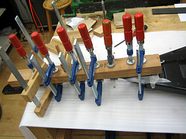 正確な位置合わせをしたら指板接着用の当て木をして接着。