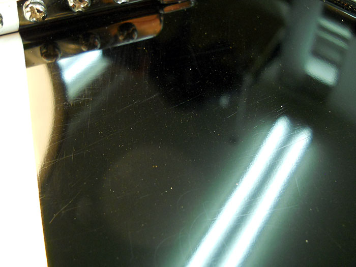 このA工房さんの場合、水研ぎで付いた「ペーパー痕」がまだ完全に残っている状態で「完成」としてしまったようです。ただしよく観察するとかなり粗めのペーパー痕と思わしきスリキズが見られるので、たとえこのギターを当方でバフィングし直してもこのスリキズは消し取る事はできないでしょう。