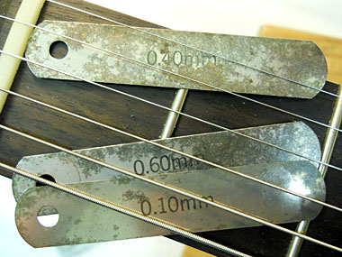 普段、私の場合はこの部分の寸法(隙間)を測る事はしませんが、試しにシックネスゲージで計測すると1弦約0.4mm・6弦約0.7mmでした。