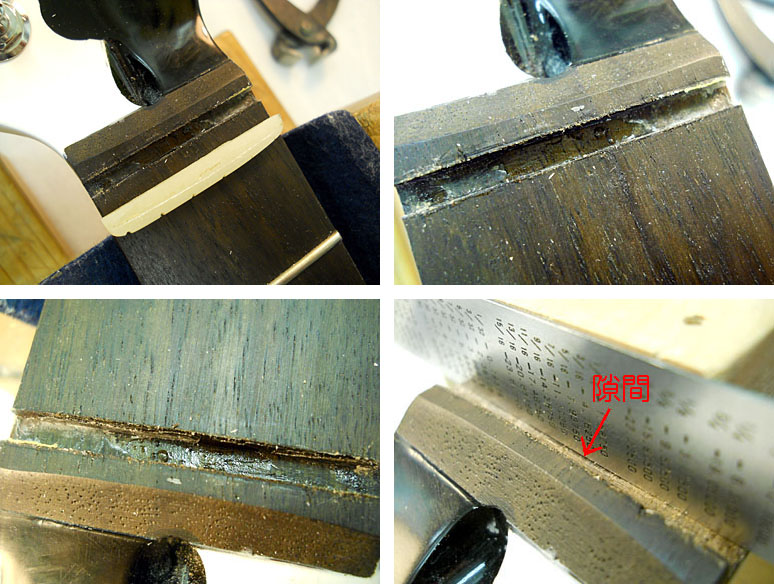 接着剤を綺麗に除去して底辺をチェックしてみると隙間が・・・・。これは新品時からこうなっていたとも考えられます。取り外したナット(A工房さんが成形して取り付けたナット)をあらためてはめ込んでみると大きさが合わずガタガタ動く状態。つまりナットの成形段階でナットを削りすぎたか、成形前のナットの大きさがすでにこのギターのナット寸法より小さかったか、です。