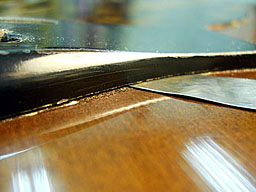 典型的なブリッジ接着剥がれです。このギターの場合はあからさまに隙間が確認できますが、一見して隙間が無いように見えてもパレットナイフ(