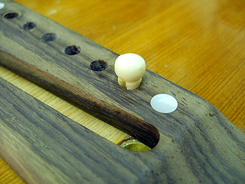 ↓↓ピンが奥まで入るようになったら、次に弦をセットしてみます。ピンが奥まで入ればいいですが、ダメならさらに弦通り道を・・・