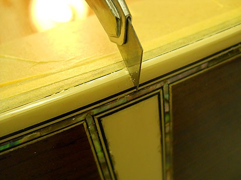 トップの時は「下側/ボディエンド側」でバインディングをカットしましたが、バックの場合↑↑このようにネックヒール部でバインディングの繋ぎ目が露出してます。なので元々の繋ぎ目であるココでカット。