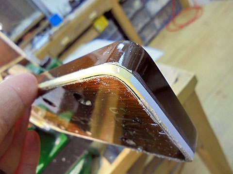 サンディングシーラーを数回吹いて、トップコート/クリアを重ねていきます。バインディング部分はアンバー色で色付けします。