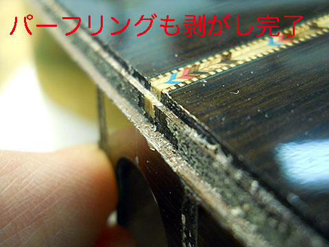バインディングとは総じていちばん外側に貼る部分の事を言います。その内側にくる貝などの装飾は全てパーフリング。