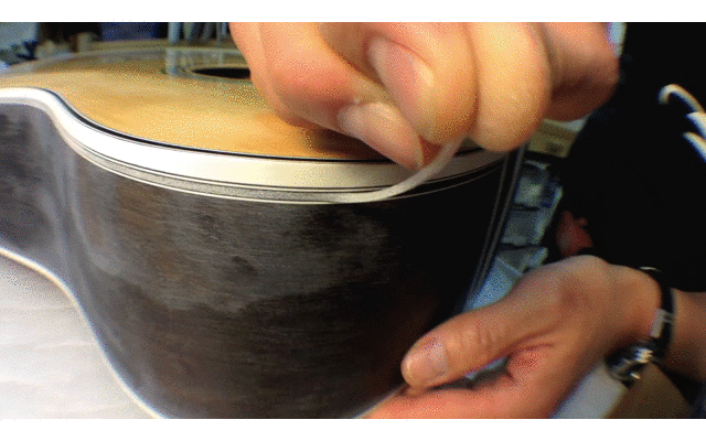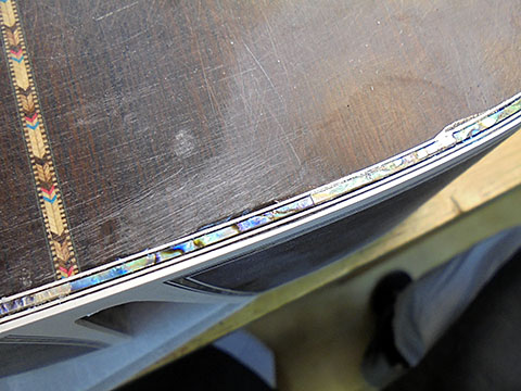 ここまで大がかりな作業をしてはじめて「完璧」な仕上がりが可能です。年に何度か今回のような装飾のお問い合わせをいただきますが、皆さん比較的簡単にできると思ってらっしゃるようですが、とんでもなく大変な作業だという事がお分かりになったと思います。マーチンやGibsonなどダヴテイルジョイントだと接着されてますからさらに大変です。