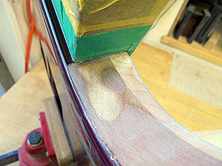 トップ面はアーチなのでやはり時間がかかります。とくにエッジ・端を削りすぎないよう注意しないと、側面から見た時のバインディング幅(高さ?)が均一ではなくなってしまいます。PRSの場合ボリュームやトーンなどノブ部分の凹みも手間がかかるところ。
