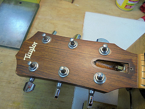 どこかのページで書いたかもしれないが、Taylorの場合このようなごくわずかな隙間を木工パテのようなもので埋めて目立たなくしてあります。