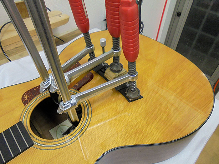 マーチン等普段から手慣れた形とは少し違うので、クランプの際も適宜、全体が圧着されるように当て木などを工夫します。
