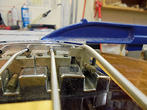 もしこのチェック段階で弦高を十分に上げ下げできないようであれば、何か策を練らないといけない。例えば、ボディのブリッジが載る部分を多少ザグる、もしくは上げ底にするべくブリッジとボディの間に何かを挟む・敷くなど。