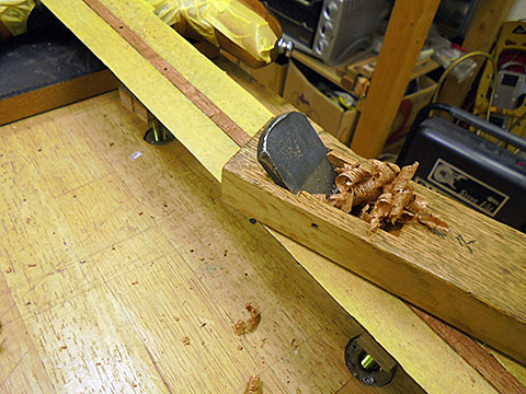 一晩おいたらカンナとノミを使い、余計な出っ張りを削っていきます。突き板に近いところはカンナが使えないのでノミで↓