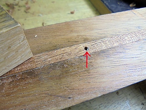 さて、ここでお気づきになった方もいるかもしれませんが、↑埋木に穴が空いているのが分かりますか?これは接着剤の「逃がし」用穴です。ピッタリに製作した埋木を溝にはめ込むと、接着剤の逃げ場がなく、「底の部分」などが完全に密着できない事があります。勿論、クランプした時に左右・隙間等から接着剤が流れ出て問題なく密着できる事のほうが大半ですが、こうした「逃げ場」を用意しておくとクランプ作業がやりやすくなります。