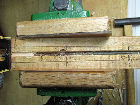 ←指板を剥がしてみるとフレット溝がネック材まで達している。バインディングが施してあるものは、通常のノコギリでは(バインディングが邪魔になり)溝をカットできない(深くできない)のでミニルーター/極小ドリル刃を使う。前回の修理でも「フレット脚の長さぶん」だけ必要最低限(約2.0mm)掘り直しました。