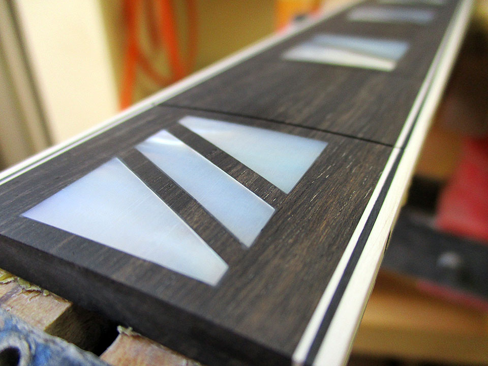 ←スポットなどの修正が完了したら、再び指板修正を行い"仕上げ"まで完成させます。すでにインレイ前に#100で精度は整えてますから、それほど削ったりすることなく仕上げられるはずです。