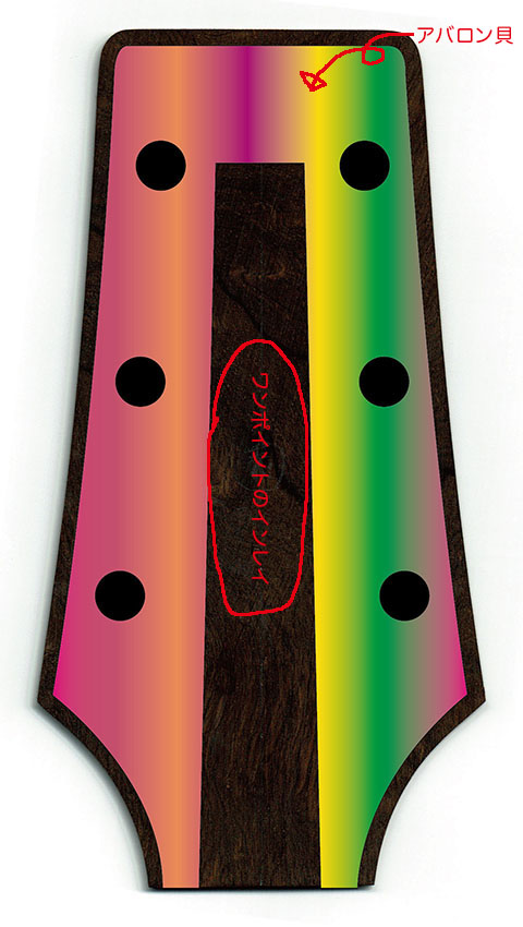 じつはこのご依頼を受けた時に「ハッと」気づいたんですが、↑↑このようにヘッド全体を覆うようなインレイ・装飾はやった事がない。