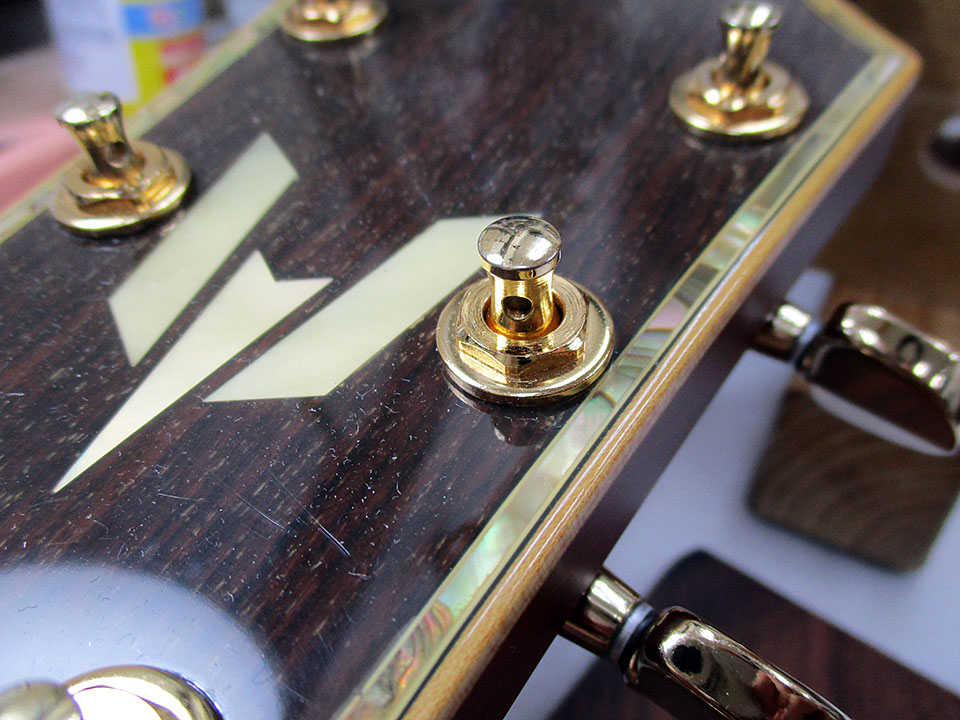 でもオーナー様のご希望はこの突き板(化粧板)をご自身で入手・用意されたハカランダ材へ交換してほしい。さらに、ヘッド先端の形状も変更/修正したい、ヘッド表面全域を覆うようにアバロン貝をインレイしてほしい、という内容でした。