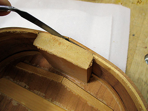 剥がしてから気づいたのですが、テイルブロックと側板の剥がれ・隙間には(このウクレレ製作時の接着剤ではない)妙に多めの接着剤の固まりが見て取れます。
