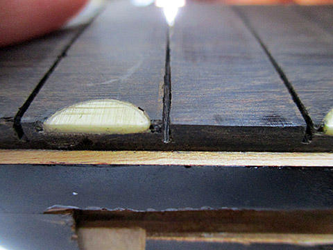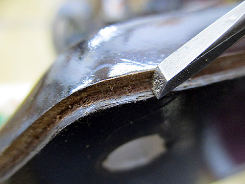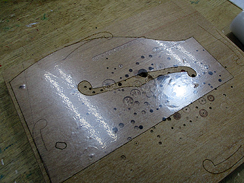 ←少し分かりづらいですが、剥がしたFホール部分を覆うように1枚透明マスキングを貼りつけます。こんな感じです↓↓ こうしないと形が崩れてしまうため。