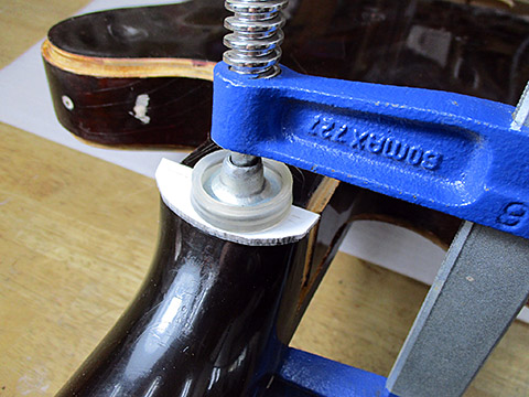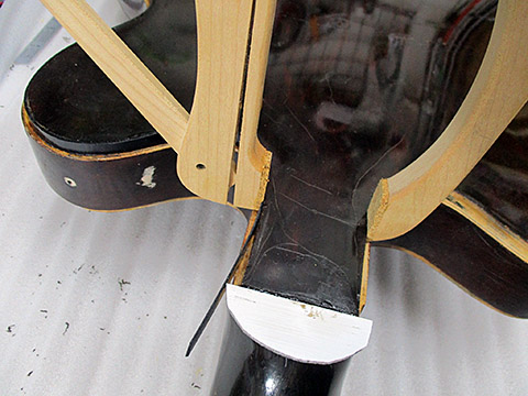 1枚接着するごとに↓↓この部分、指板&ネックの下に潜り込む部分はカッターなどでボディ表面と面一にしておきます。