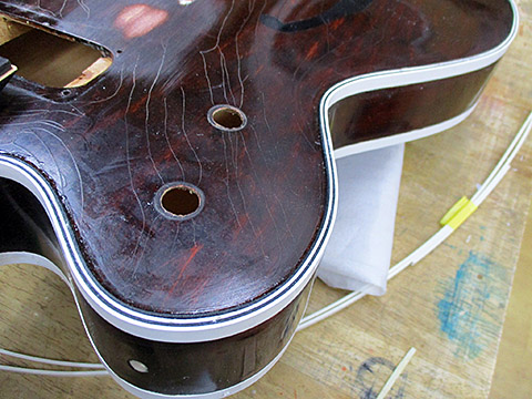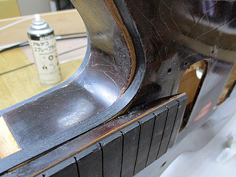 着色方法が判明してスッキリしたと同時に不安にもなりました。なぜなら、このギターは「合板」です。表層はうす〜いので運が悪ければ思いきり目立つ場所で「下地層」が露出する可能性も。まあ、濃い色合いなので、誤魔化しはできるでしょう(塗装の着色層でのボカシ)。