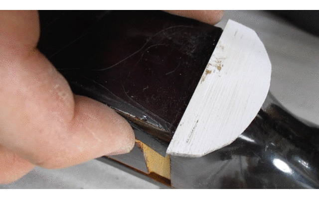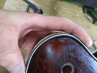 このギターのようにオールドで経年変化がはげしいものは「側板」なども平坦・平面ではなく、いたるところ「面」がいい加減なんです。言い換えると「基準となる面が無い」状態なので、ローラーガイドなどを使っても場所によっては深く掘りすぎたりと、一定の寸法で掘る事はほぼ不可能。