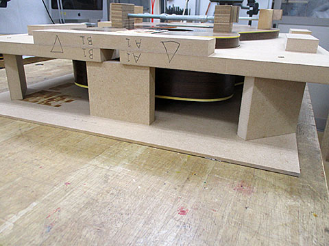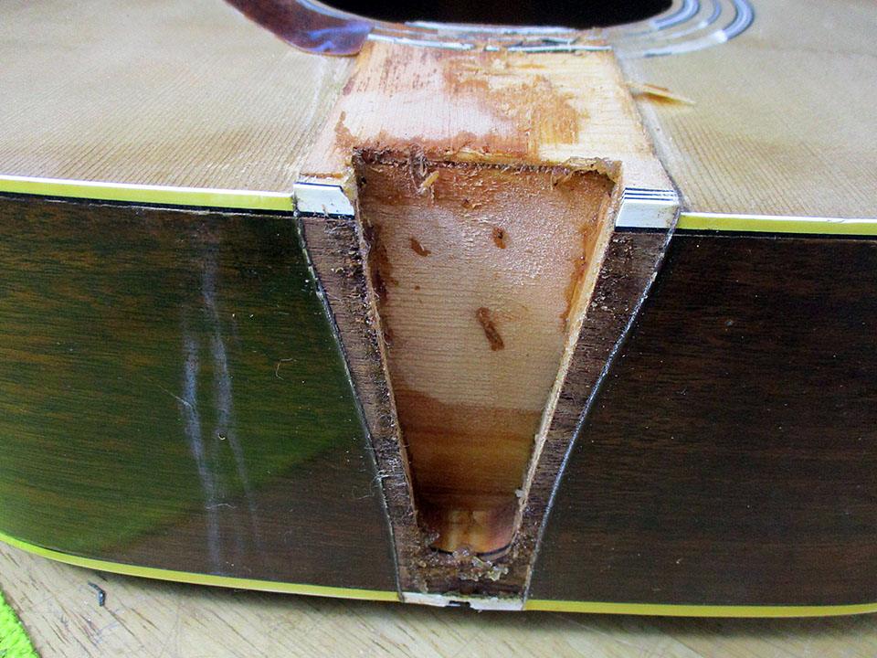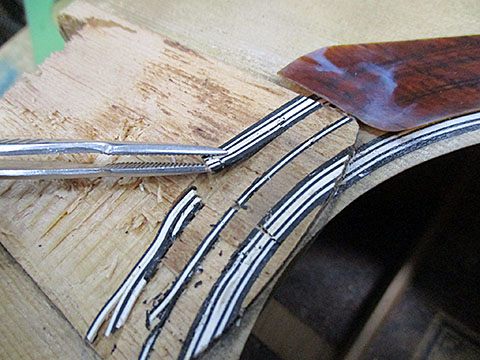 ←このようなつっかえ棒をボディ内部に仕込み、トップ板を剥がしたり作業する間ずっとこれをかけておきます。