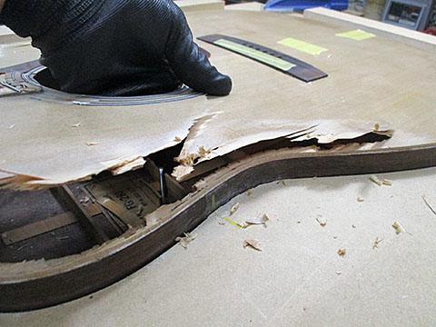 なんとかネックブロック部分を剥がせたので、ライニング材との接着を攻めるが、すこし力を入れすぎると↓↓パキッ