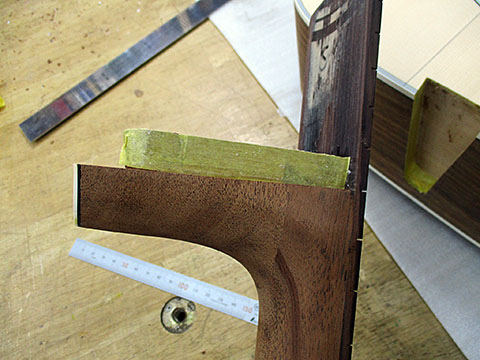 おなじく↓↓ネック側もマスキングして塗り塗り・・・ そして木工パテを盛り盛り・・・↓↓
