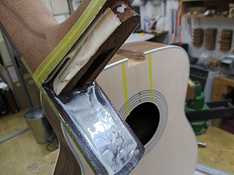 ネック側・ボディ側、双方に接着剤を塗布し合体。